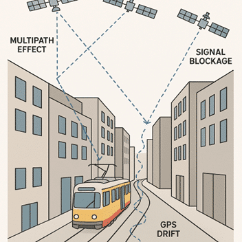 In dense urban environments, GPS inaccuracies can significantly disrupt tram operations. These errors are often caused by signal blockage, multipath effects, or poor satellite geometry. This can lead to position deviations of several meters. The consequences in a rail-based context are substantial.